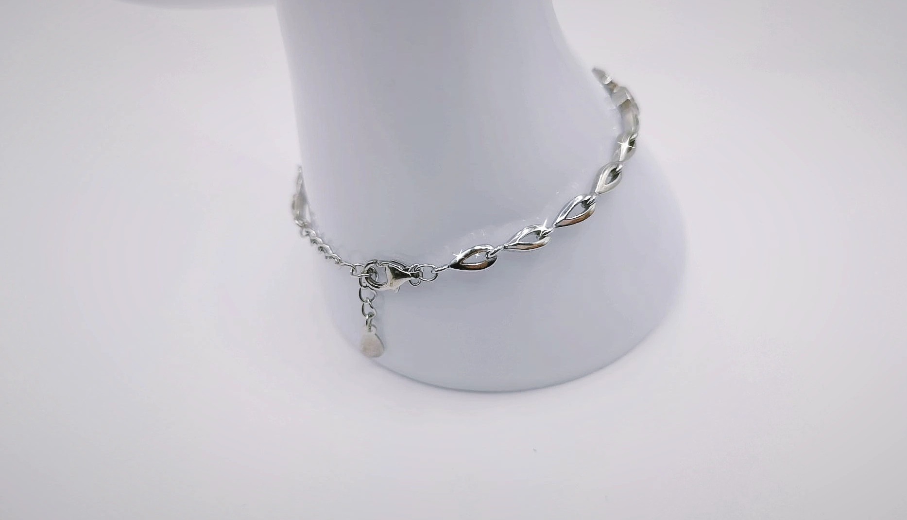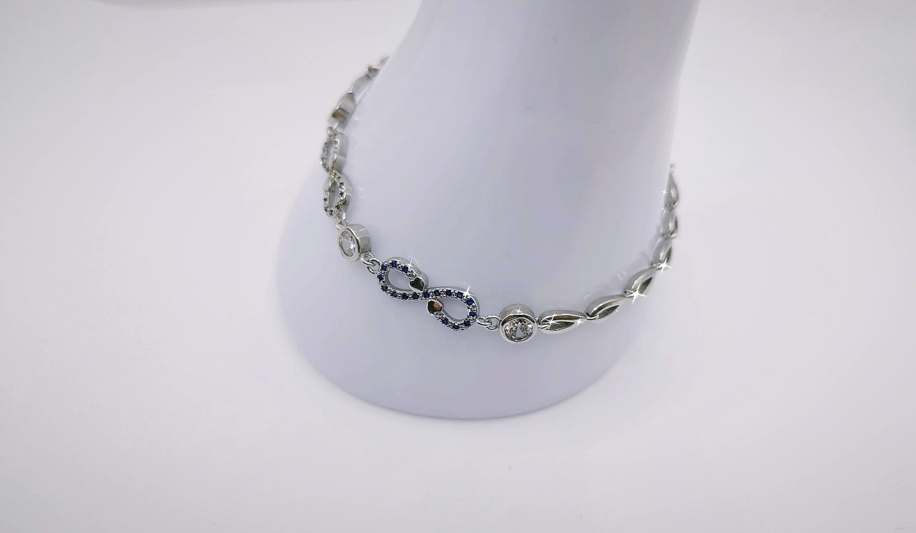 Zilveren infinity armband met blauwe en witte zirkoniasteentjes.
