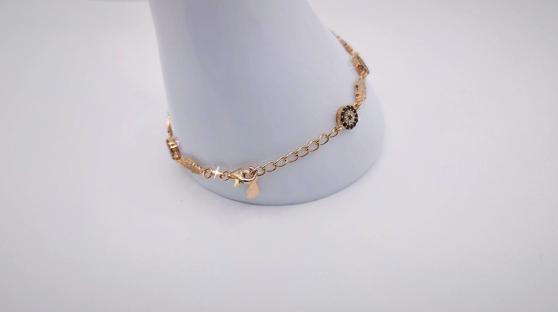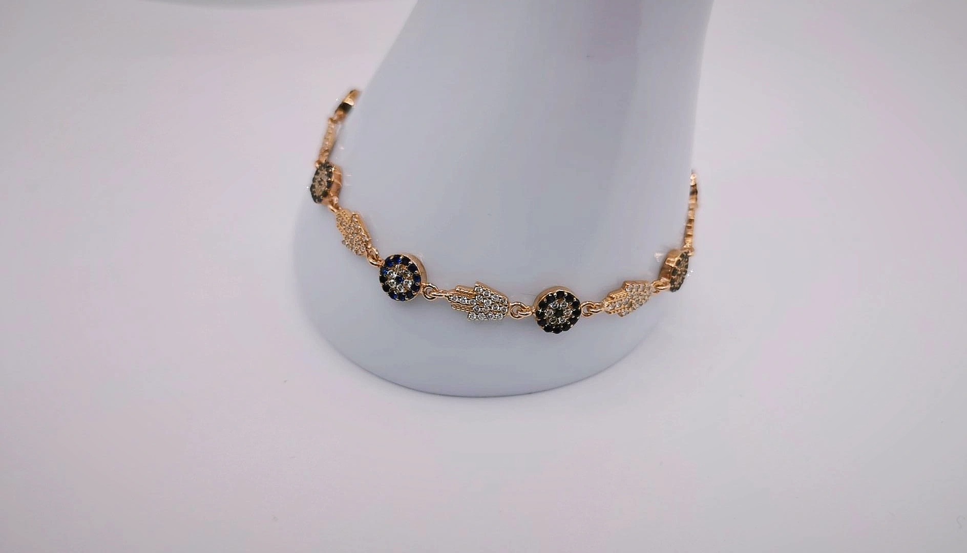 Roségekleurde zilveren armband met blauwe en witte zirkoniasteentjes.