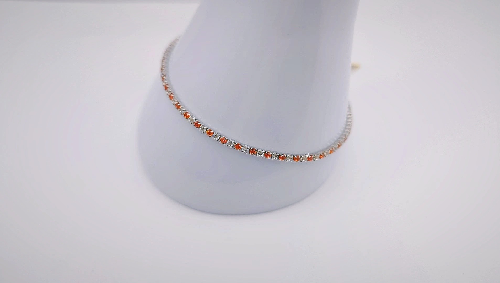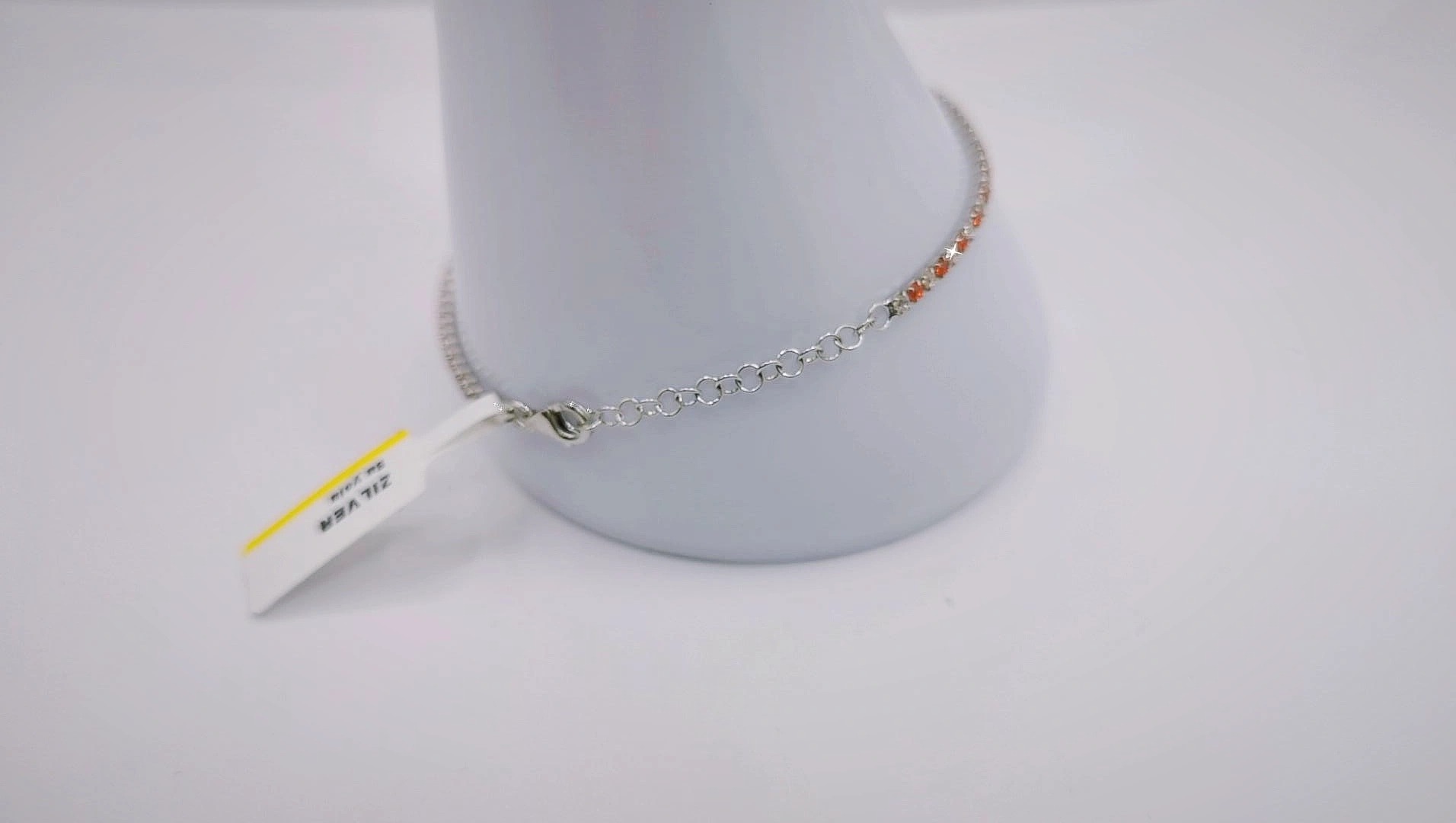 Zilveren armband gezet met koraalgekleurde en witte zirkoniasteentjes.