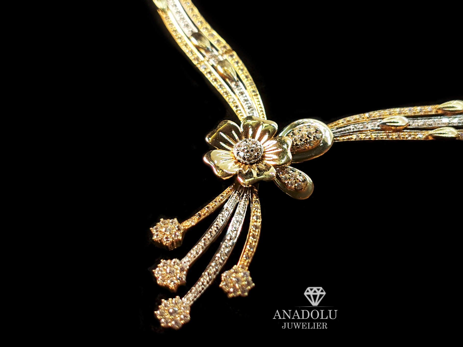 Schitterende set met bloemen design, gemaakt van 14 karaat goud. Deze set bestaat uit een collier met bijpassende oorbellen en armband.